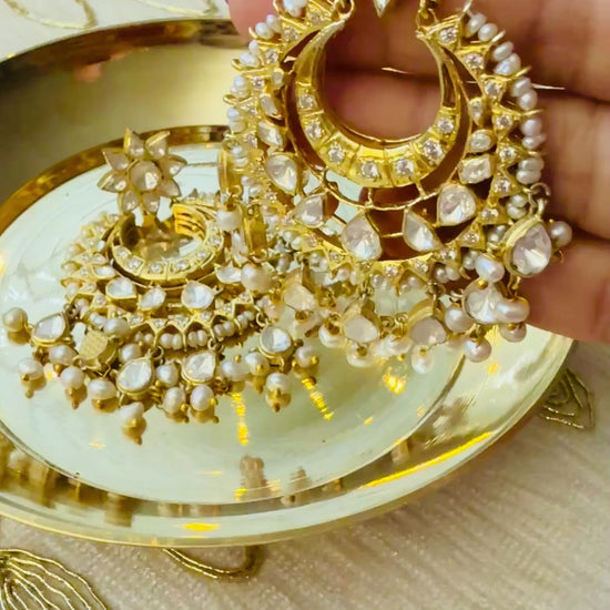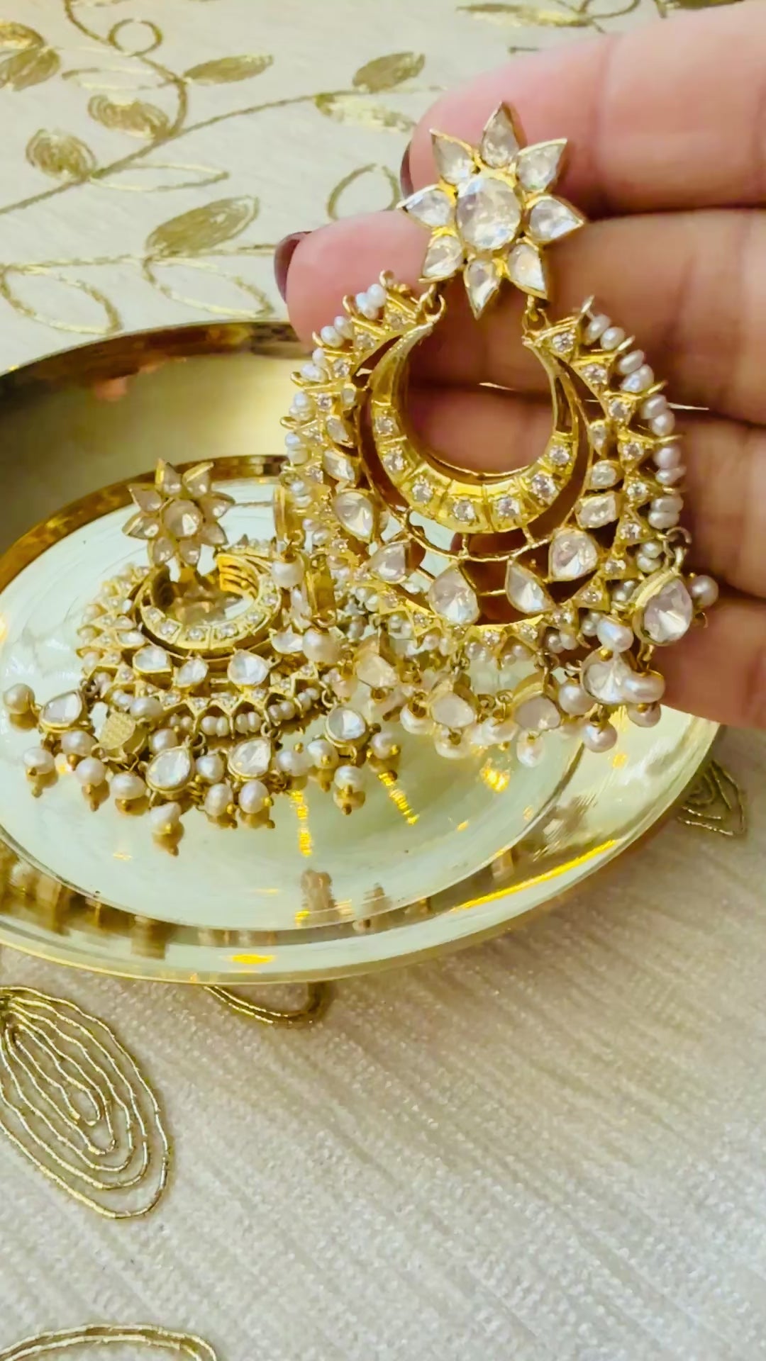 Crafted in sterling silver with mossanite polkis, these beautiful Chandbalis are strung in a bunch of rice seed pearls. Definitely a show stopper✨✨